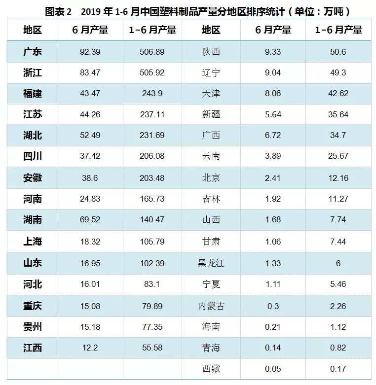 ????????1-6月塑料制品累計產(chǎn)量排名前五位(廣東、浙江、福建、江蘇和湖北)的總產(chǎn)量達(dá)到1725.51萬噸,占到全國總產(chǎn)量53.3%。(按6月規(guī)模企業(yè)統(tǒng)計)