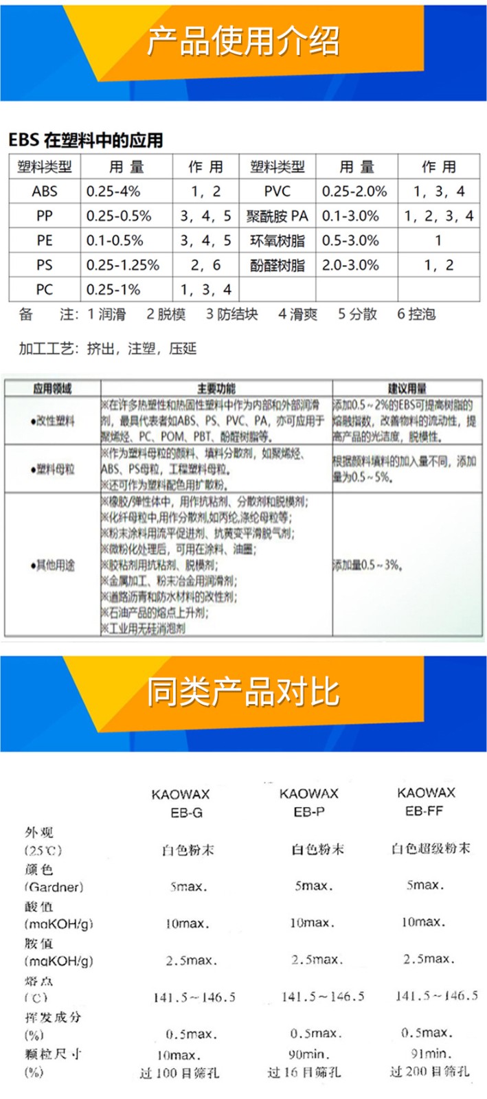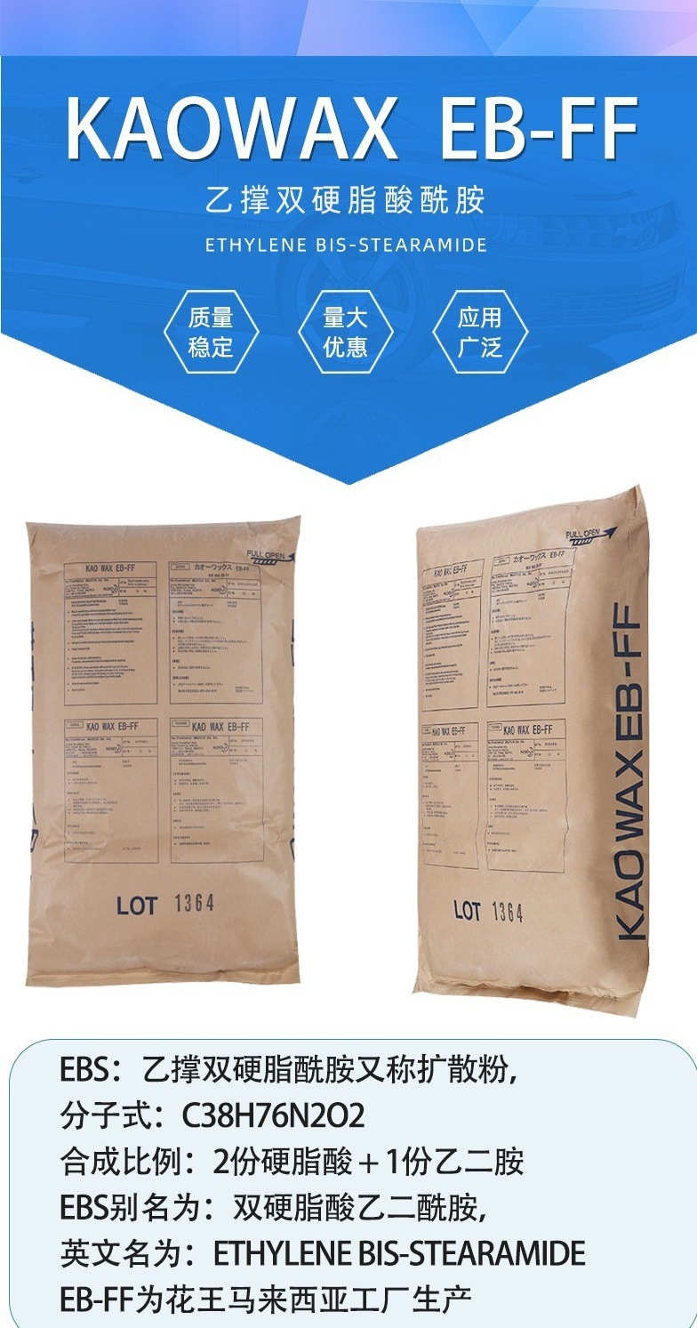 - EBS花王EB-FF顏料擴散粉增塑劑塑料分散劑花王EBS EBFF潤滑脫模劑 物性表, EBS花王EB-FF顏料擴散粉增塑劑塑料分散劑花王EBS EBFF潤滑脫模劑 產品參數,EBS花王EB-FF顏料擴散粉增塑劑塑料分散劑花王EBS EBFF潤滑脫模劑 性能表,EBS花王EB-FF顏料擴散粉增塑劑塑料分散劑花王EBS EBFF潤滑脫模劑 出廠報告, MSDS,, 物質安全資料表, UL黃卡,{ SGS報告, RoHS, 食品級認證, NSF飲用水標準, 產品資料, 產品性能, 出廠報告, 原廠原包, 代理商, 熱變形溫度, 熔指數, 流動系數, 抗沖擊性能、沖擊強度, 低溫韌性、低溫抗沖擊性能, 熔體流動系數、熔體流動速率, 加工工藝、加工參數、加工溫度, 歐盟RoHS 德國FDA 美國FDA 日本FDA