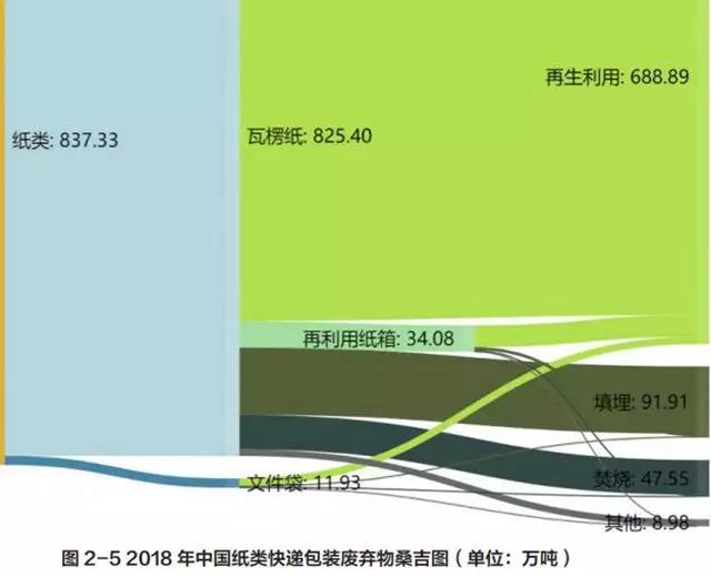 調(diào)查發(fā)現(xiàn)快遞紙箱類(lèi)包裝廢棄物只有不到 5% 被重復(fù)使用,按重量計(jì)算約有 80% 的紙箱被回收,還有約 15% 混入生活垃圾。以 2018 年為例,我國(guó)快遞行業(yè)共消耗紙類(lèi)包裝材料 837.33 萬(wàn)噸(不包括快遞單號(hào)紙),其中文件袋用紙 11.93 萬(wàn)噸,瓦楞紙箱、紙筒和膠帶芯等瓦楞紙消耗量 825.40 萬(wàn)噸。這其中僅有約 34.08 萬(wàn)噸的瓦楞紙箱被重復(fù)使用,通過(guò)流動(dòng)回收業(yè)者回收的約有 688.89 萬(wàn)噸快遞包裝廢紙(瓦楞紙 679.43 萬(wàn)噸,文件袋 9.46 萬(wàn)噸)。計(jì)算得到快遞紙類(lèi)包裝產(chǎn)生量和流量信息如圖 2-5 所示: