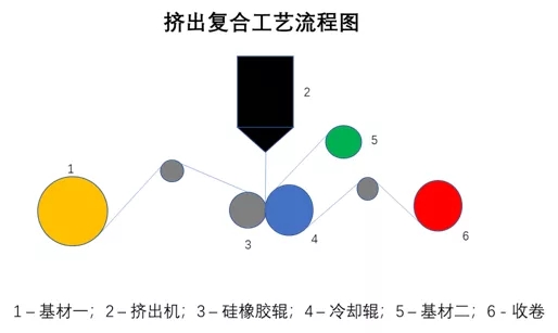 ????????擠出復合是將聚乙烯等熱塑性材料在擠出機內熔融后擠入扁平???,成為片狀薄膜流出后立即與另一種或兩種薄膜通過冷卻輥和復合壓輥復合在一起。與其他復合方法相比,擠出復合具有設備成本低、投資少、生產環境清潔、復合膜可以不存在殘留溶劑、生產效率高、操作簡便等優點,擠出復合在塑料的復合加工中占有很重要的位置。擠出復合膜可以用擠出涂覆和擠出復合兩種方法制得。