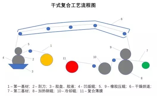????????在復合膜的各種加工技術中,干式復合是我國最傳統、應用最廣泛的一種復合技術,廣泛應用于對食品、藥品、化妝品、日用品、輕工產品、化學品、電子產品等的包裝。干式復合是用涂布裝置(一般采用凹版網線輥涂布)在塑料薄膜上涂布一層溶劑型膠粘劑,經復膜機除去溶劑而干燥,在熱壓狀態下與其他基材復合,如薄膜、鋁箔等粘合成復合膜,工藝流程如下圖所示,由于它是在膠粘劑“干”的狀態(無溶劑狀態)下復合的,因此叫干式復合。